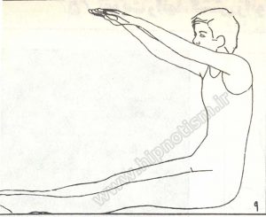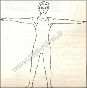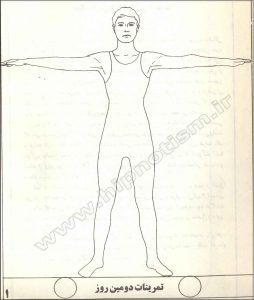 ۱- فکر خودرا متمرکزکنید، پاها را حدود۶۰ سانتی متر از هم بازنگهدارید، آرام دستها را تا شانه بالا بیاورید، دقت کنید که کف دستها به طرف پائین باشند.