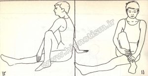 ۹-به تصاویر ۶-۷-۸ مراجعه کنید، این حرکات را انجام دهید و سعی نمائید به طرف داخل بیشتر خم شوید تا آنجا که بتوانید با دستها ماهیچه پشت پا را لمس کنید، اگر نتوانستید سعی کنید، پشت زانو را بگیرید.