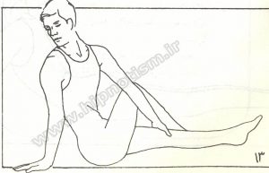 در این حال ده ثانیه توقف نمائید آنگاه در حالیکه زانوی راست را محکم گرفتهاید به شکل تصویر ۱۲ به جلو بچرخید و استراحت نمائید. اکنون تا منتهی الیه سمت راست خود بچرخید و ده ثانیه توقف کنید. حال آهسته به جلو بچرخید و استراحت نمائید. سپس چرخش به سمت چپ را تکرار کنید و ده ثانیه توقف نمائید. اکنون به جلو بچرخید، دست را از زانو بردارید پاها را دراز کنید و آماده تمرین بعدی شوید.