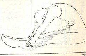 ۱۰-ماهیچه پشت پا یا پشت زانوها را محکم نگهداشته، سعی کنید تا میتوانید بدن را به طرف پائین بیاورید. پیشانی را نیز به طرف زانوها متوجه نمائید. توجه کنید آرنجها به سمت خارج خم شود و زانوها راست باشد. فشار به خود وارد نسازید. در همین حالت قدری به طرف جلو متمایل گردید و مدت بیست ثانیه توقف کنید. آهسته به حالت قائم برگردید و آماده تمرین بعدی شوید.